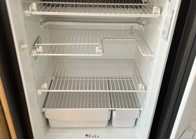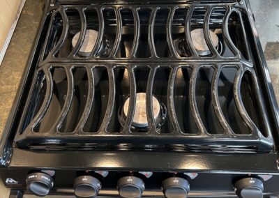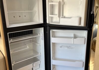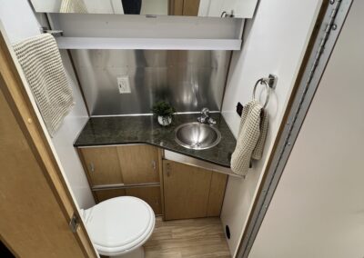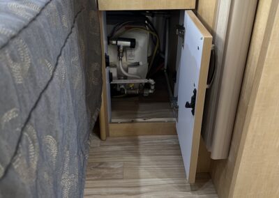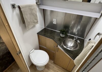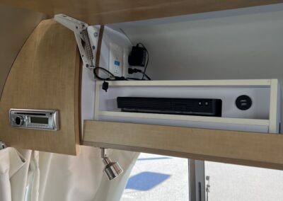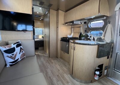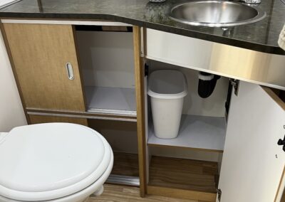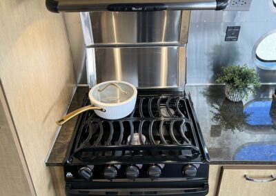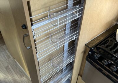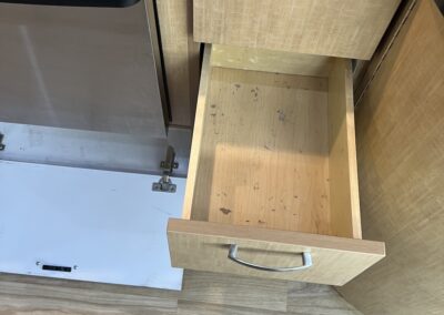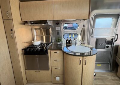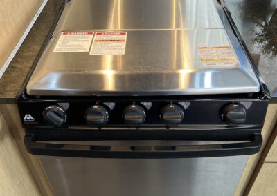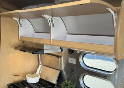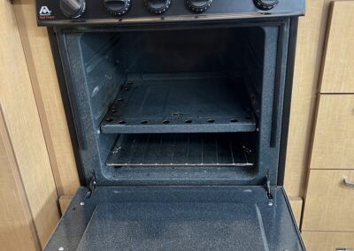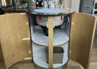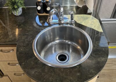 - Kitchen Features – LP 3 Burner Cooktop, Baraldi Cooking Vent with Light, Fire Extinguisher, Laminate Galley Top, Stainless Steel Sink with Cutting Board Sink Cover, Custom Handcrafted Flatware Organizer