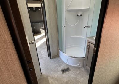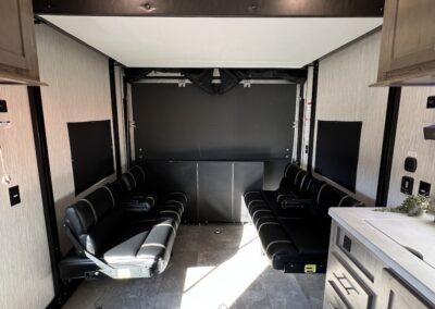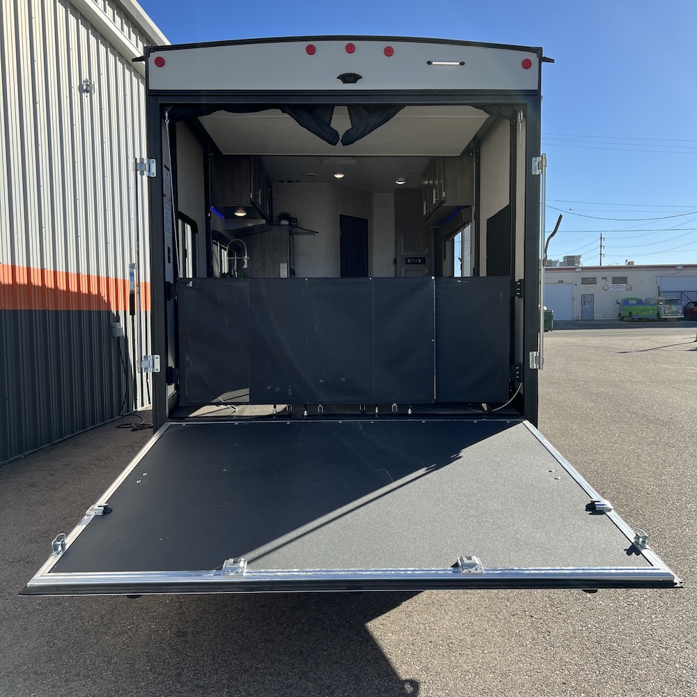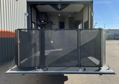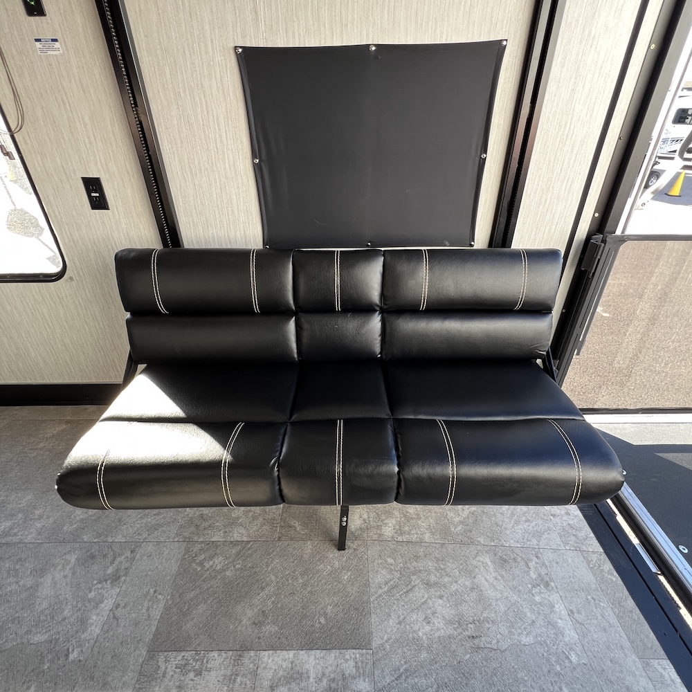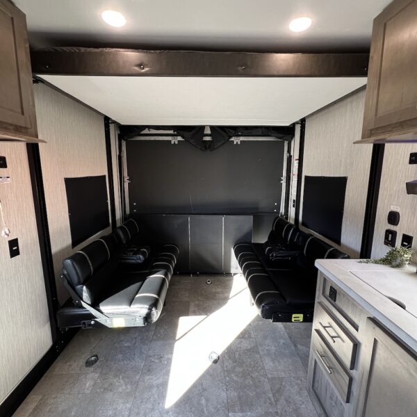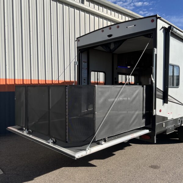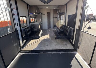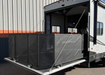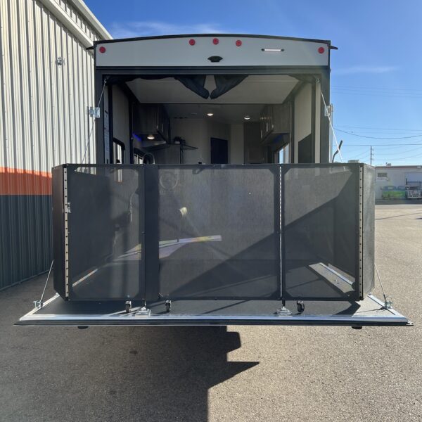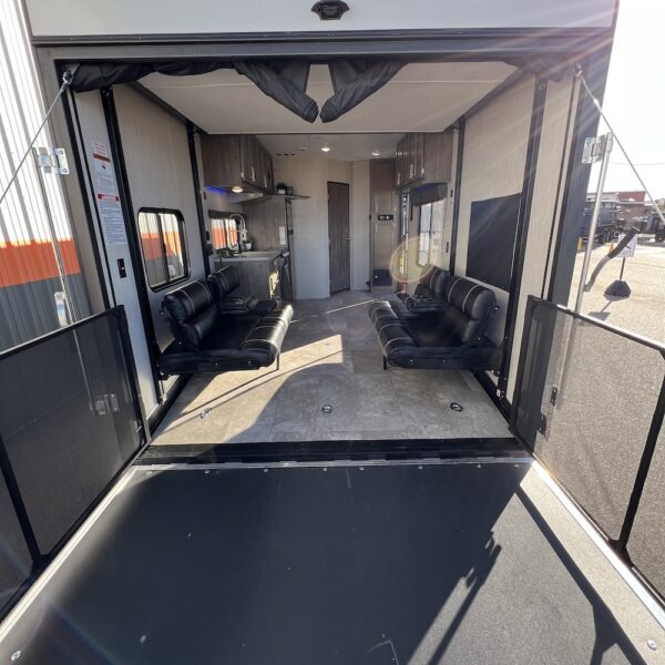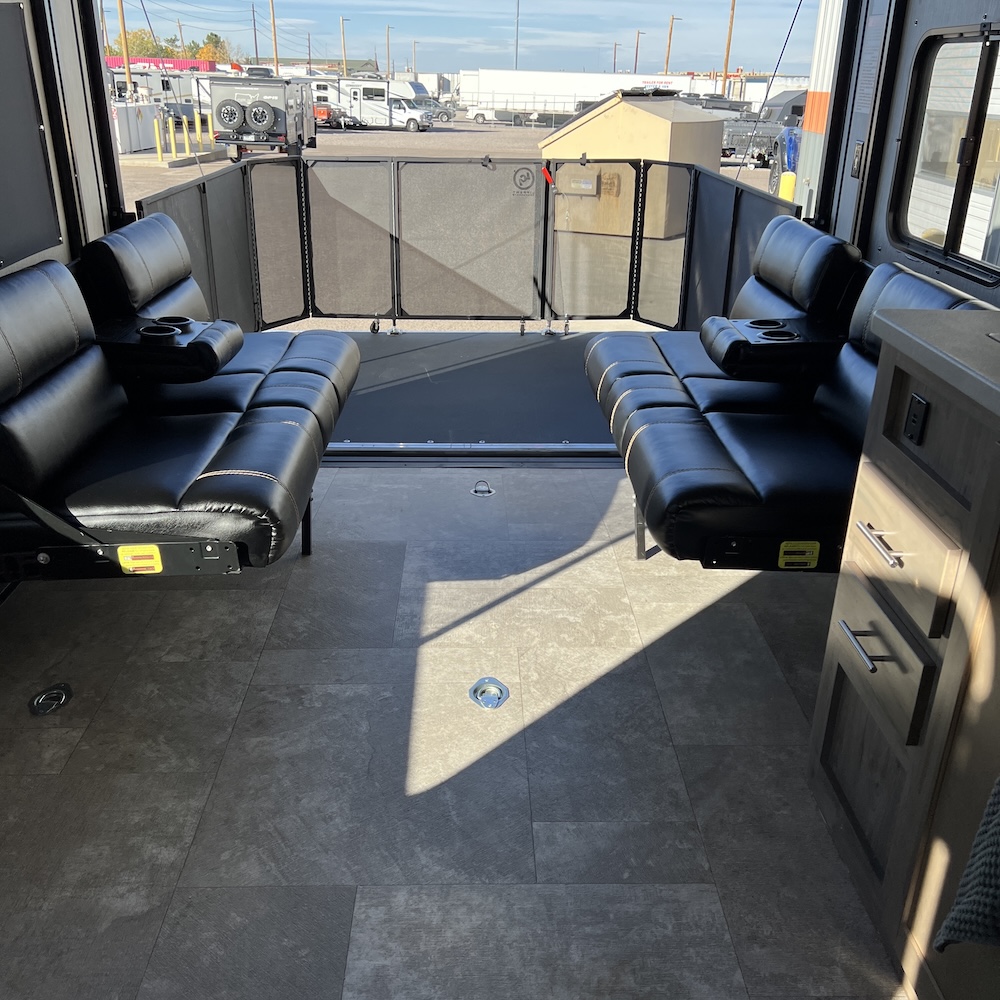But that’s not all! This bad boy comes ready for off-the-grid adventures with features like a 30-gallon fuel station, 4kw generator, and 6-point automatic leveling system to ensure a perfectly comfy camp, no matter the terrain. Plus, a ramp door patio system with railings and screens lets you seamlessly expand your living space and enjoy the outdoors under a star-studded sky.