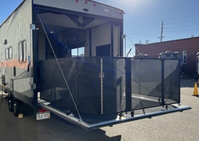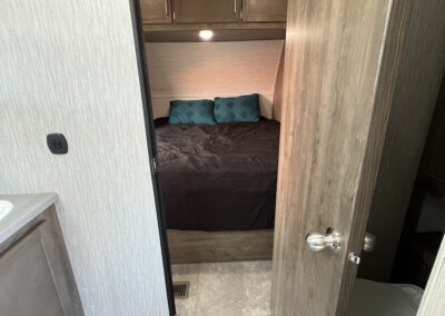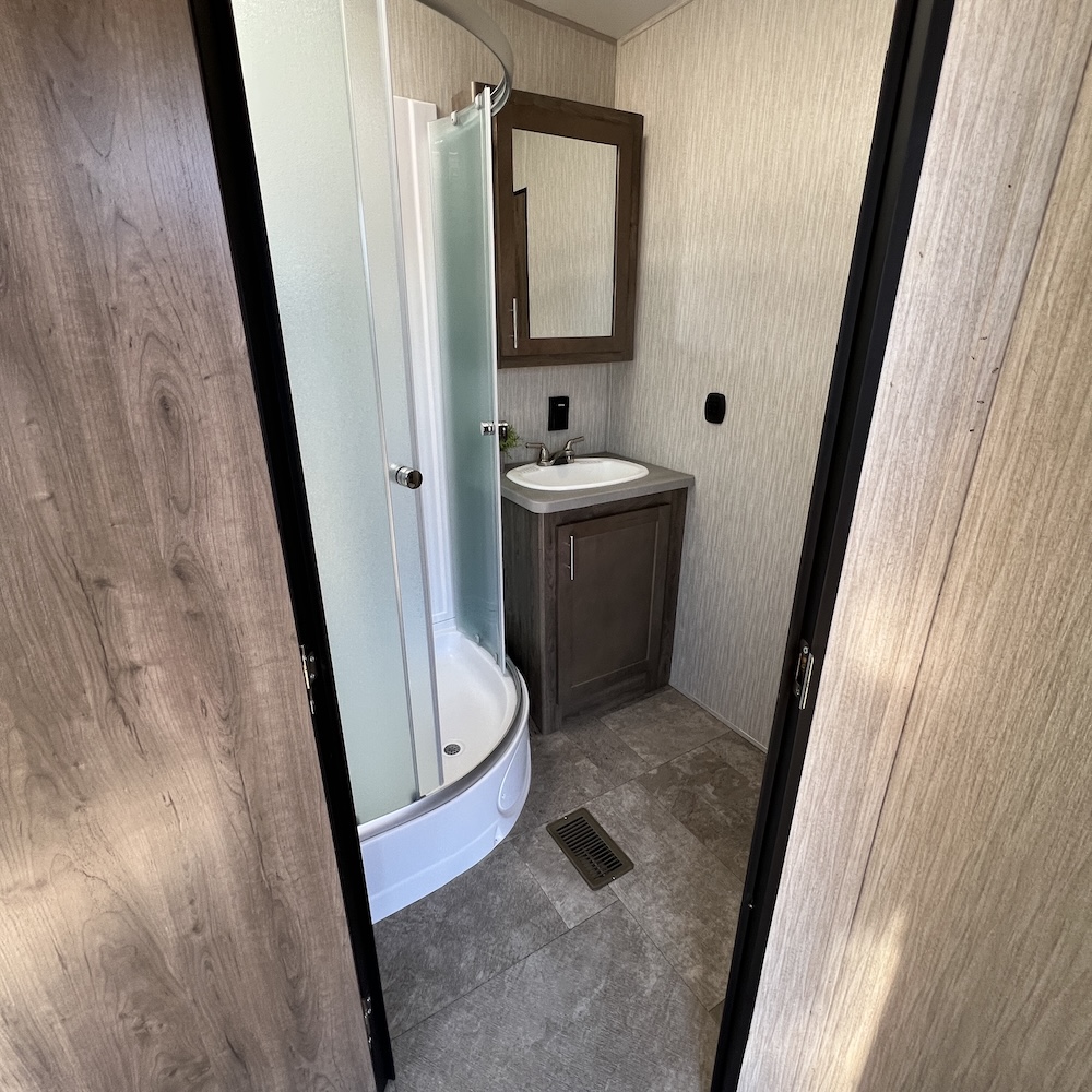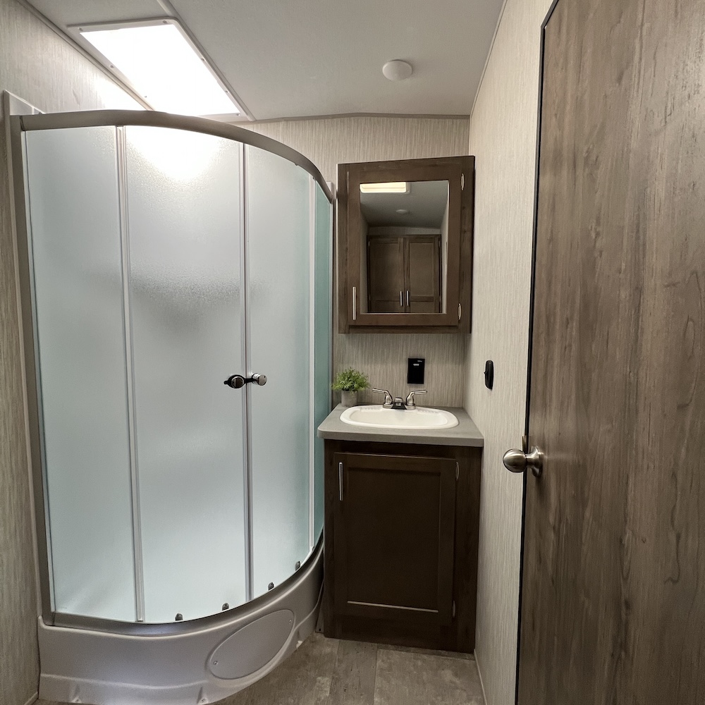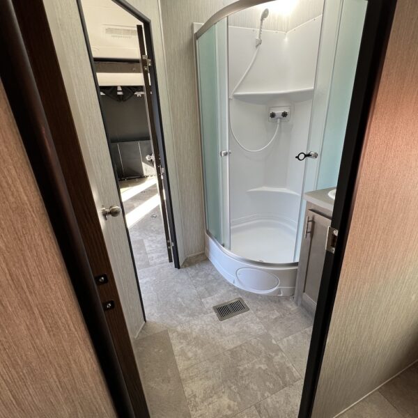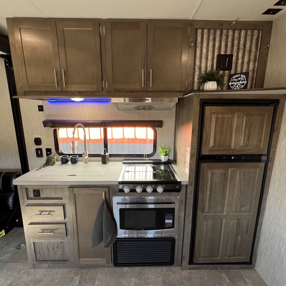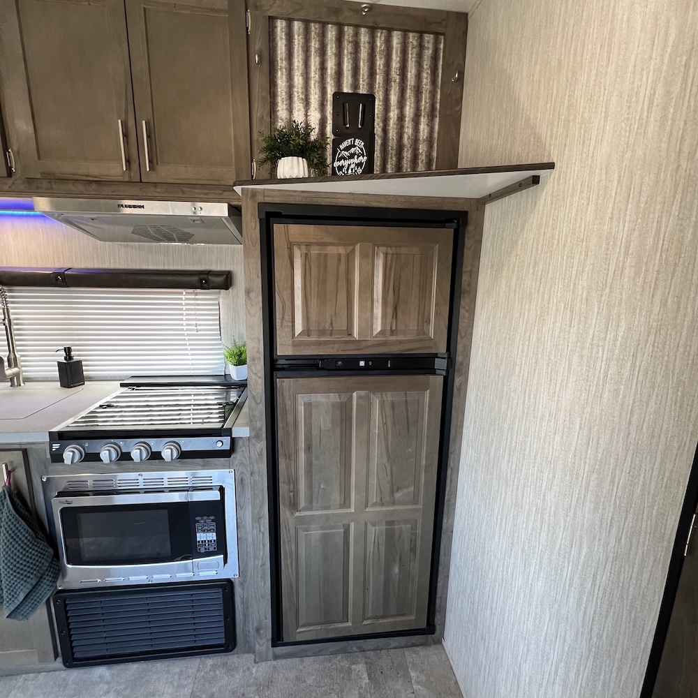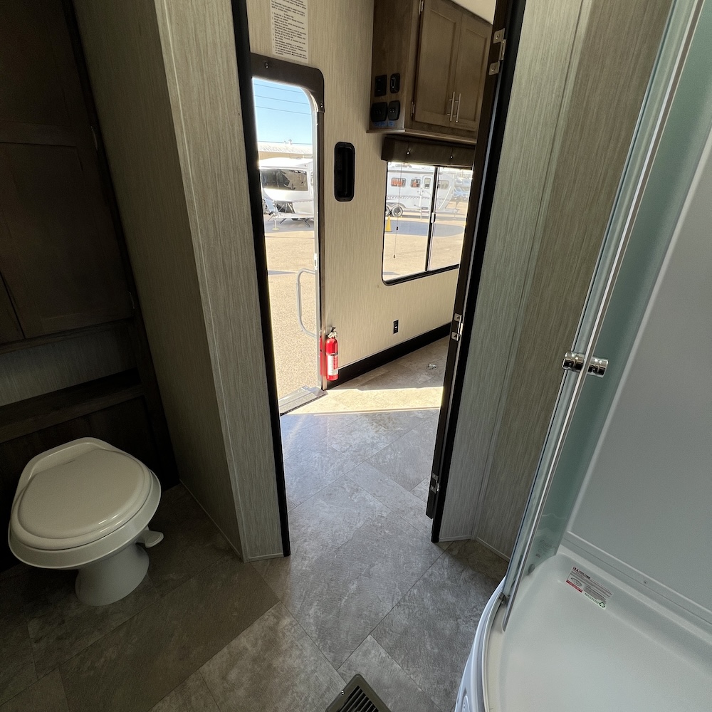 But that’s not all! This bad boy comes ready for off-the-grid adventures with features like a 30-gallon fuel station, 4kw generator, and 6-point automatic leveling system to ensure a perfectly comfy camp, no matter the terrain. Plus, a ramp door patio system with railings and screens lets you seamlessly expand your living space and enjoy the outdoors under a star-studded sky.