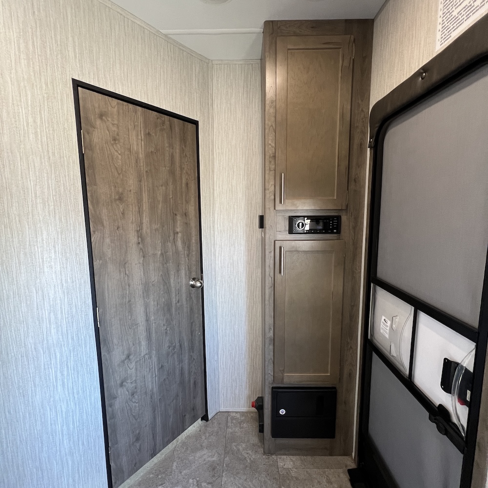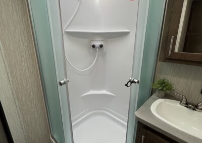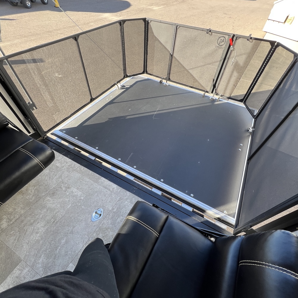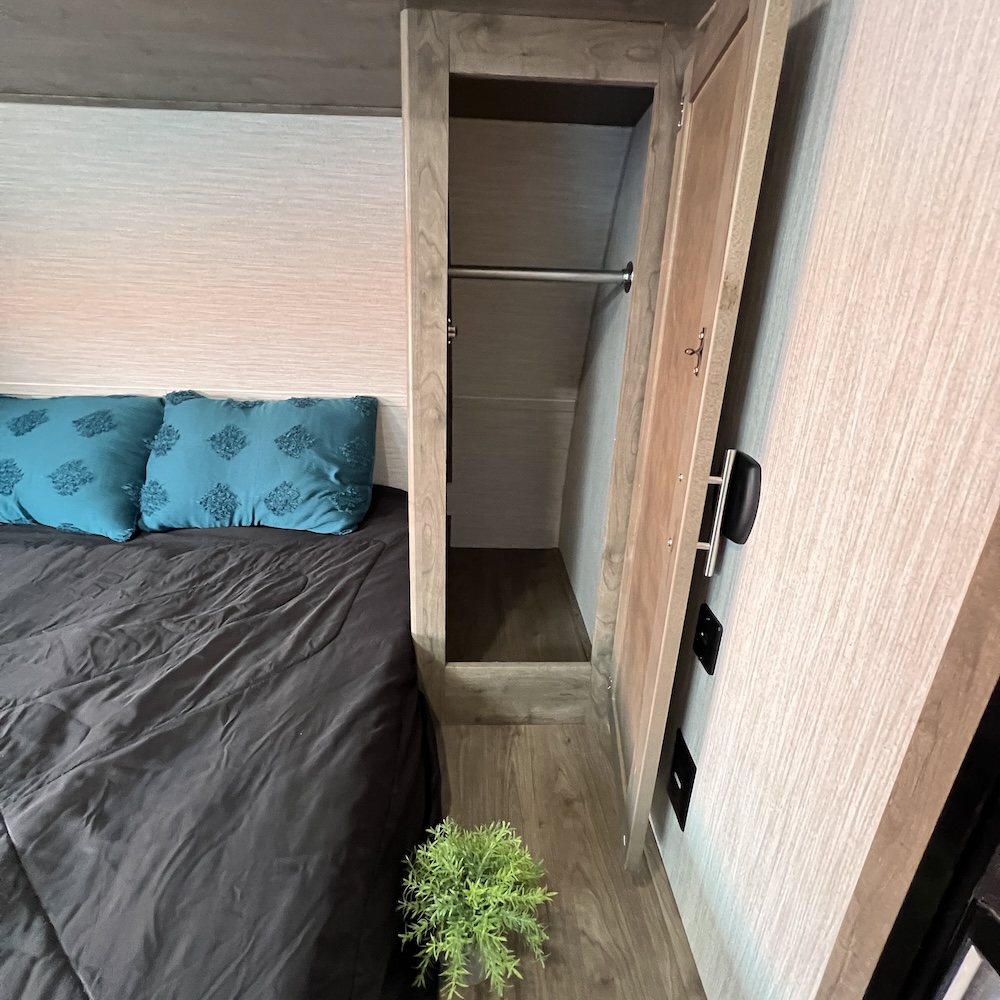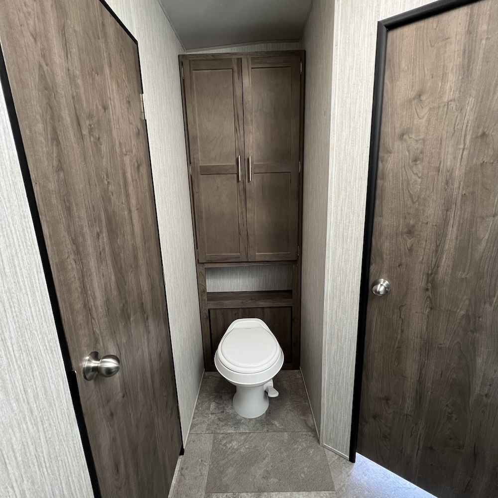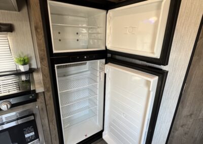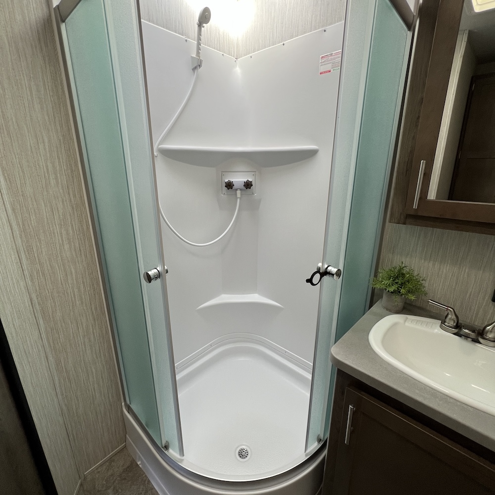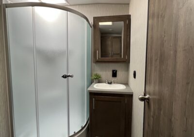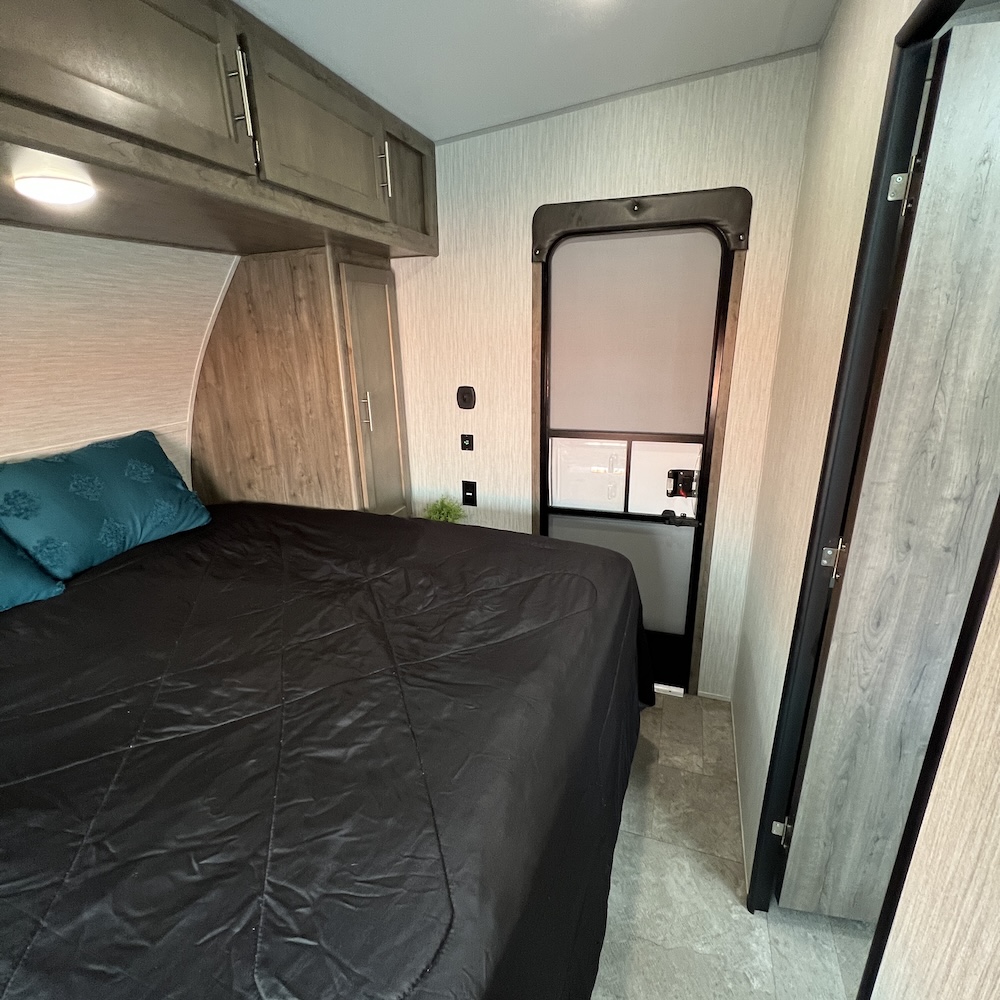 But that’s not all! This bad boy comes ready for off-the-grid adventures with features like a 30-gallon fuel station, 4kw generator, and 6-point automatic leveling system to ensure a perfectly comfy camp, no matter the terrain. Plus, a ramp door patio system with railings and screens lets you seamlessly expand your living space and enjoy the outdoors under a star-studded sky.