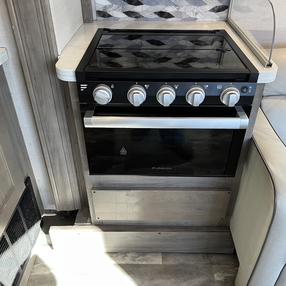 - Oven with 3-burner range and vent hood
