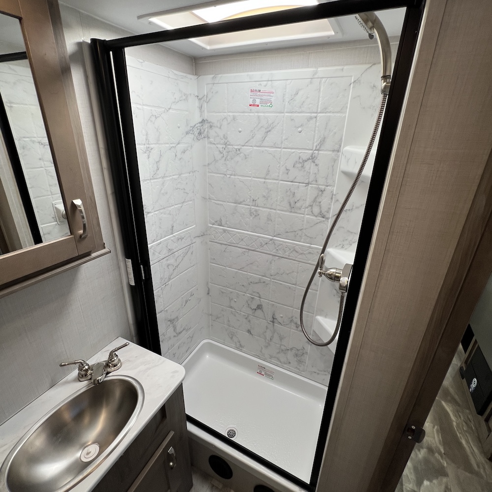 - Power vent and shower skylight in bath