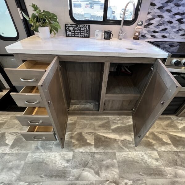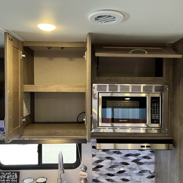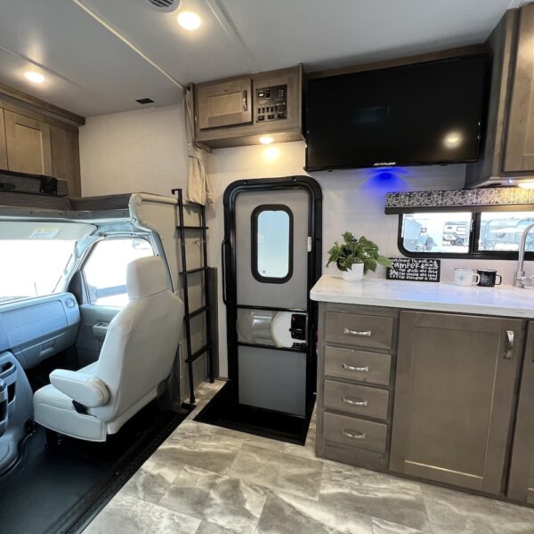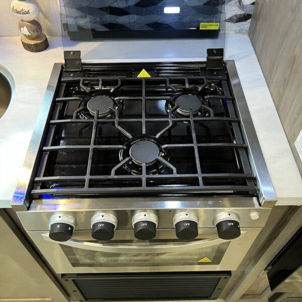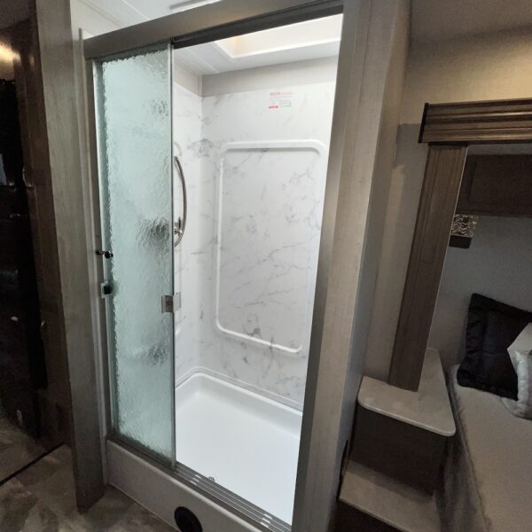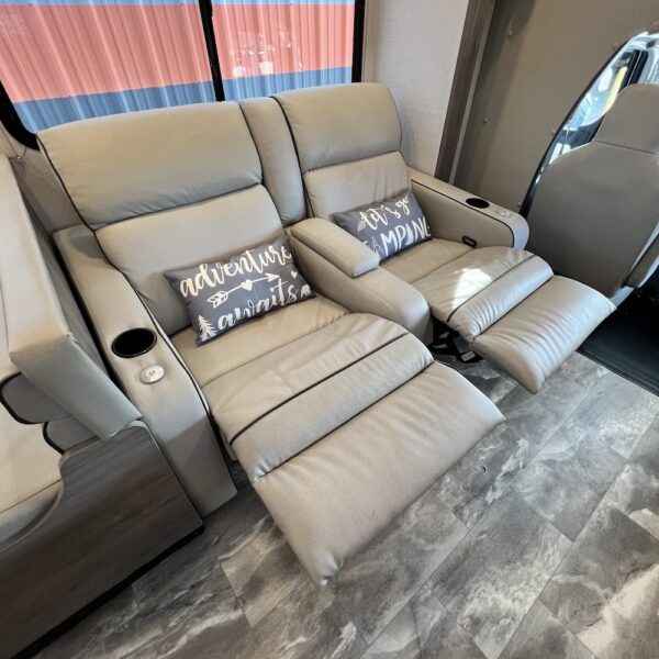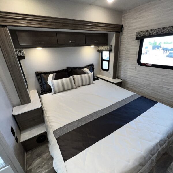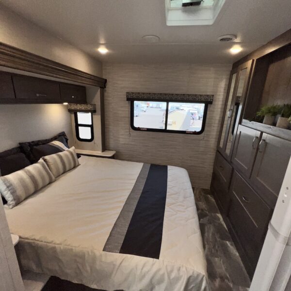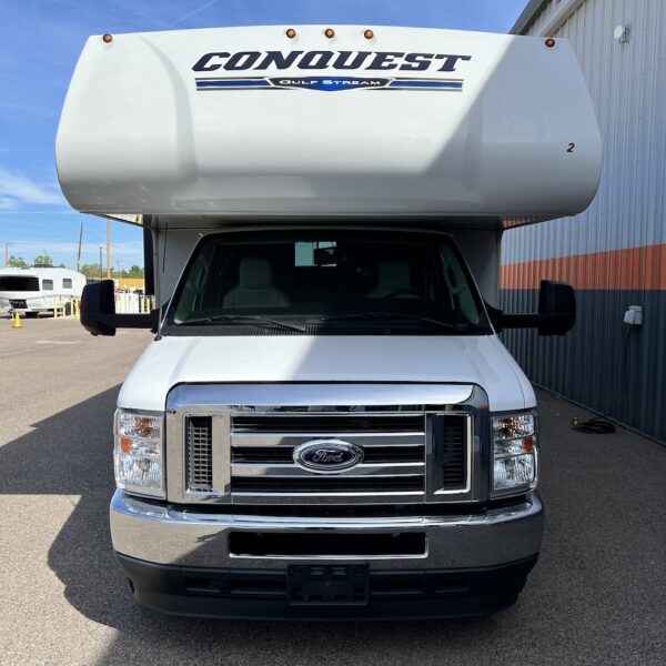 This 2024 GulfStream Conquest 6320 is a 33′ Class C motorhome that checks all of the boxes. It features dual slides, theatre-style recliners, a separate shower and lavatory area, as well as a private rear bedroom. The large kitchen and upgraded stainless steel work for all your cooking needs. The huge super-slide has a generous dinette as well as a dual recliner, creating a large open living and dining area.