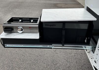 - Kitchen w/ 10 Cu Ft 12V Refrigerator, 2 Burner Cooktop, Convection Microwave Oven, Farmhouse Sink with Brushed Nickel Faucet