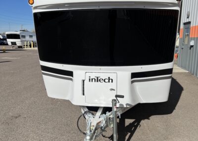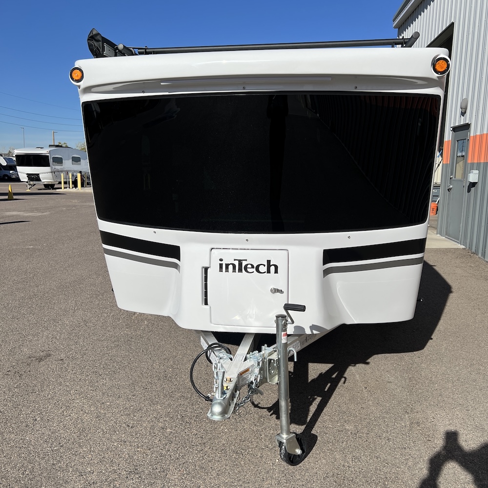 The 2026 inTech Luna Rover comes well-equipped with standard features designed for comfort and convenience, including an efficient 8K BTU A/C to keep the interior cool on warmer days, comfortable Futon Mattresses ensuring restful sleep, durable and stylish Infinity Woven Flooring, a practical 2-burner cooktop for meal preparation, a large farmhouse-style sink complemented by a sleek brushed nickel faucet, and a MaxxAir Vent Fan for excellent ventilation. It also features a reliable Dexter Torsion Axle for a smooth towing experience, a user-friendly 30 Amp Load Center for managing electrical systems, and Solar Prep, making future solar panel integration simple.