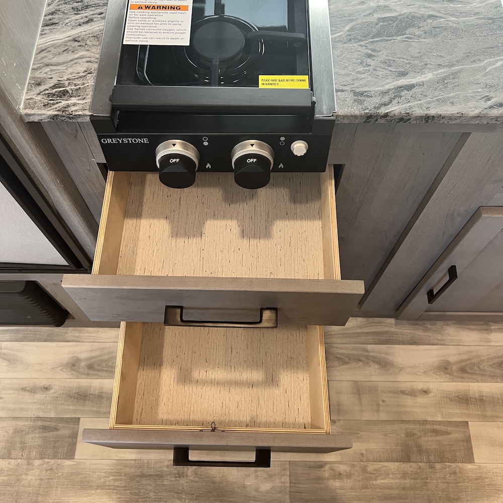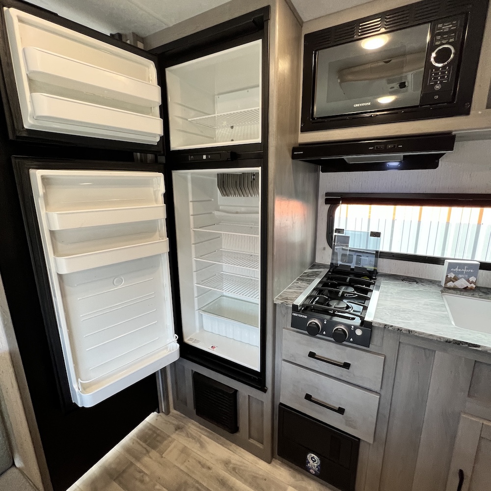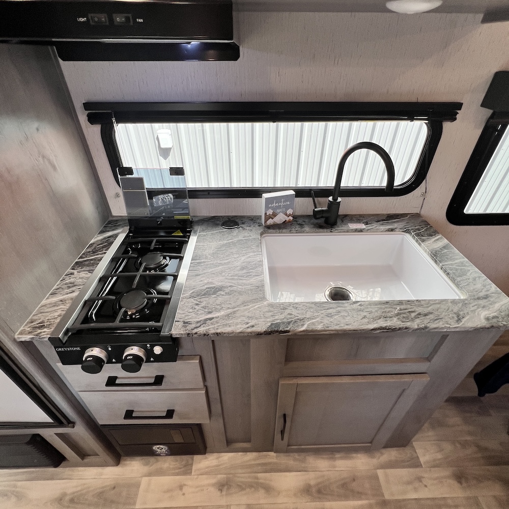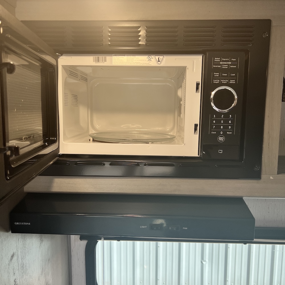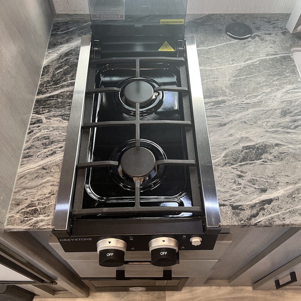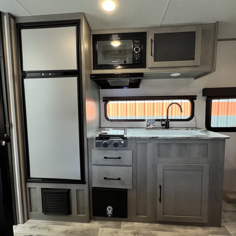 - Full Kitchen w/Â 2-Burner Stove, Microwave, 2-Way Refrigerator