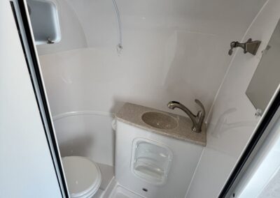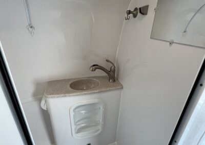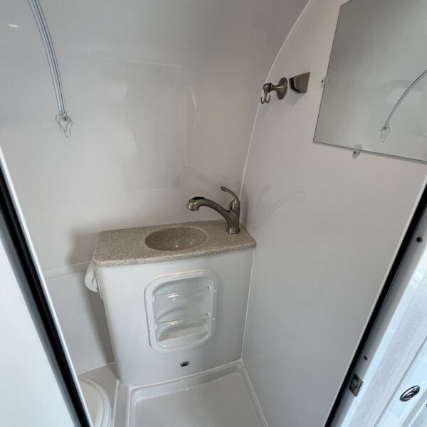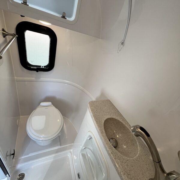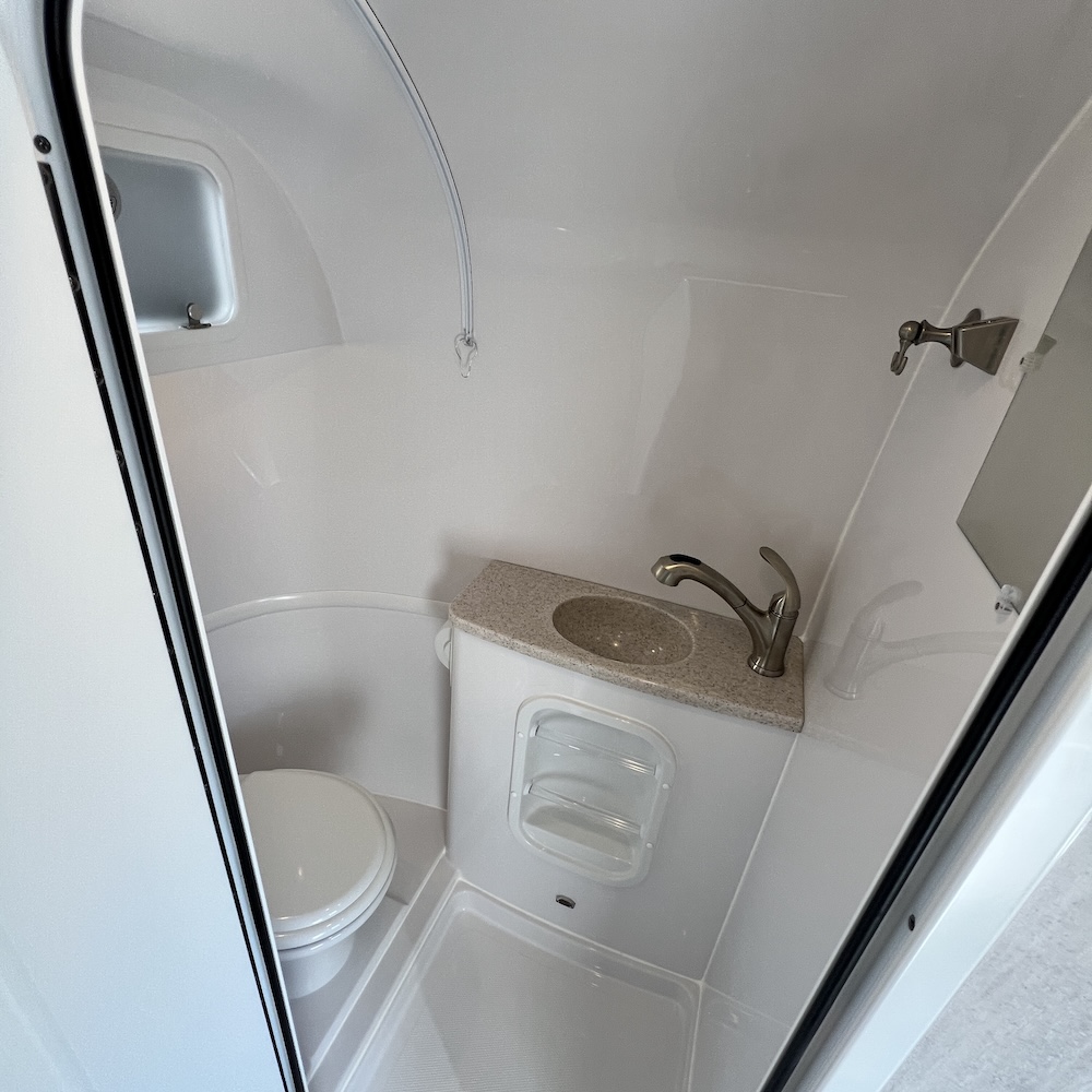 - Full Bath with Dometic 311 Toilet (Low Profile with Porcelain Bowl), Brushed Nickel Faucet with Pull Out Shower Wand, Mirror Tinted Door