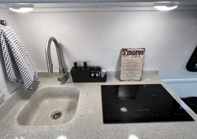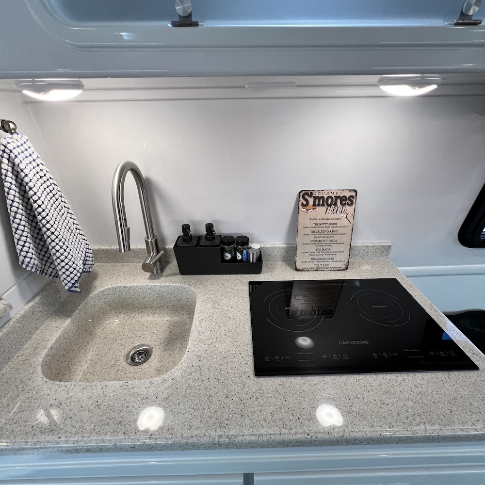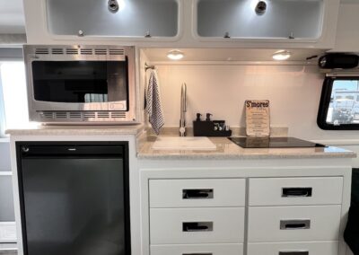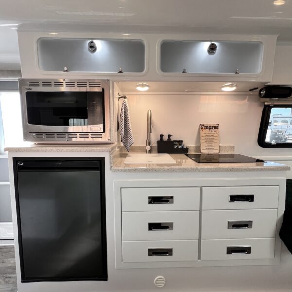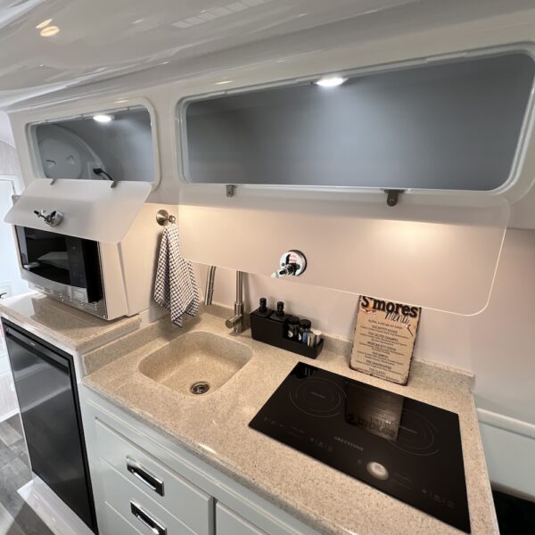 - Kitchen with Induction Cooktop, 2-Way Compressor Refrigerator (12v, 120v), Stainless Steel Microwave