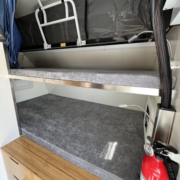- Two bunks with mattresses – Top bunk: 80” x 33”, Lower bunk: 80” x 45”