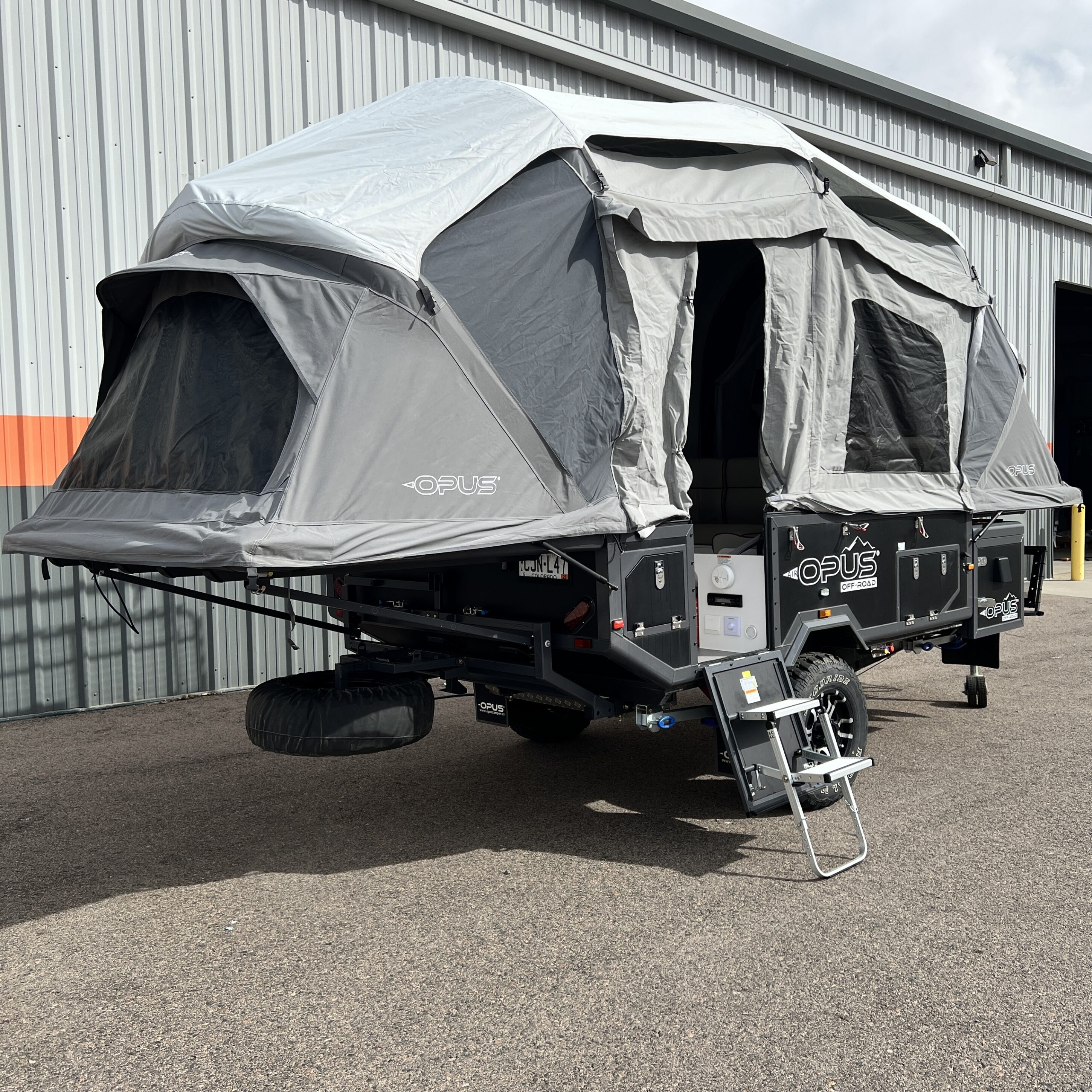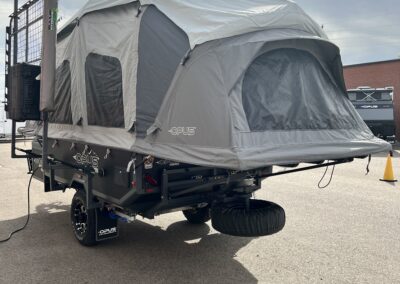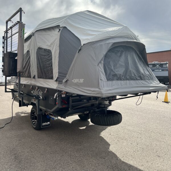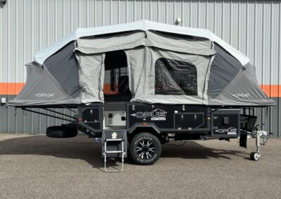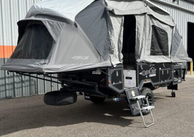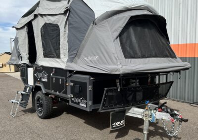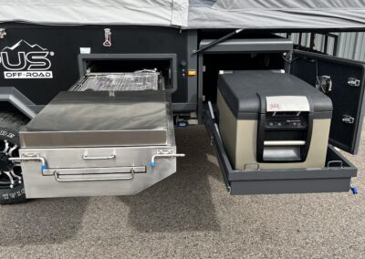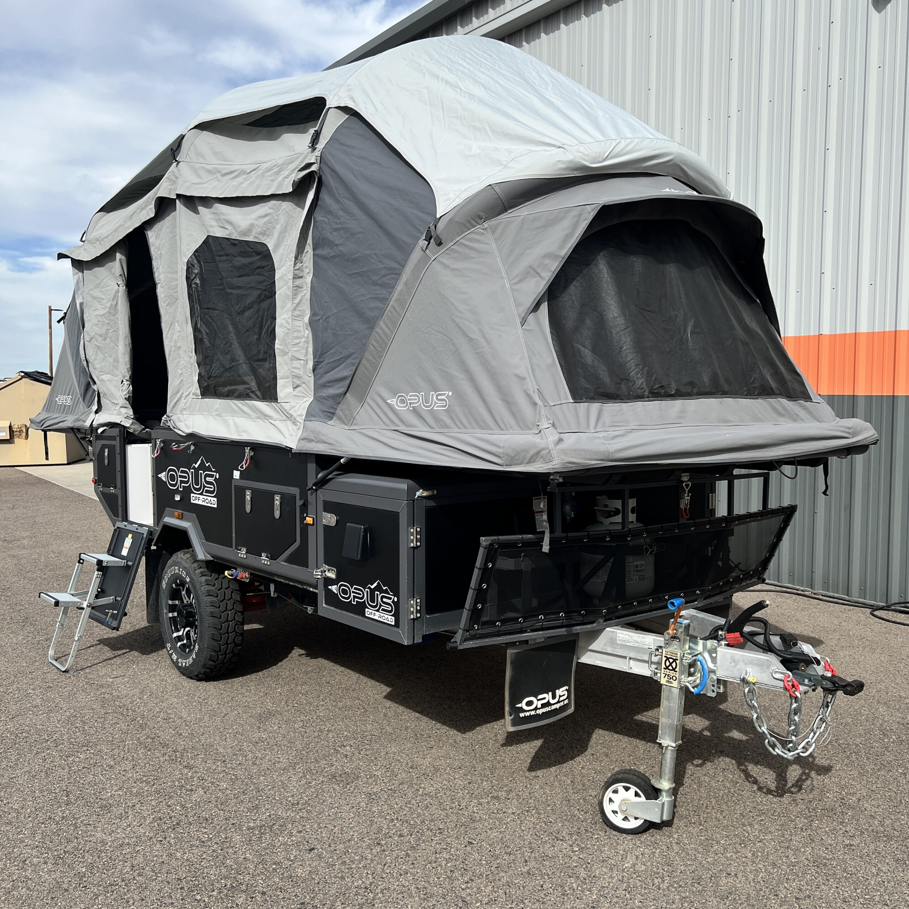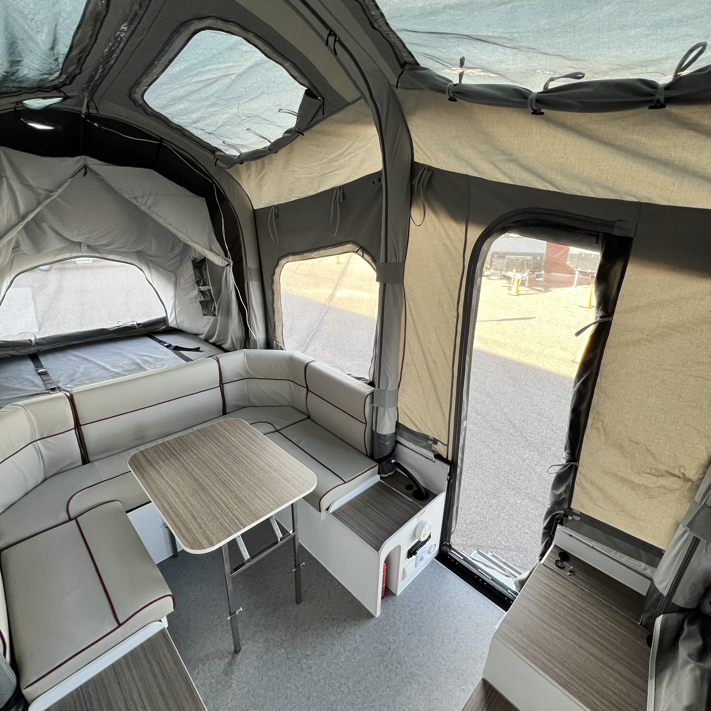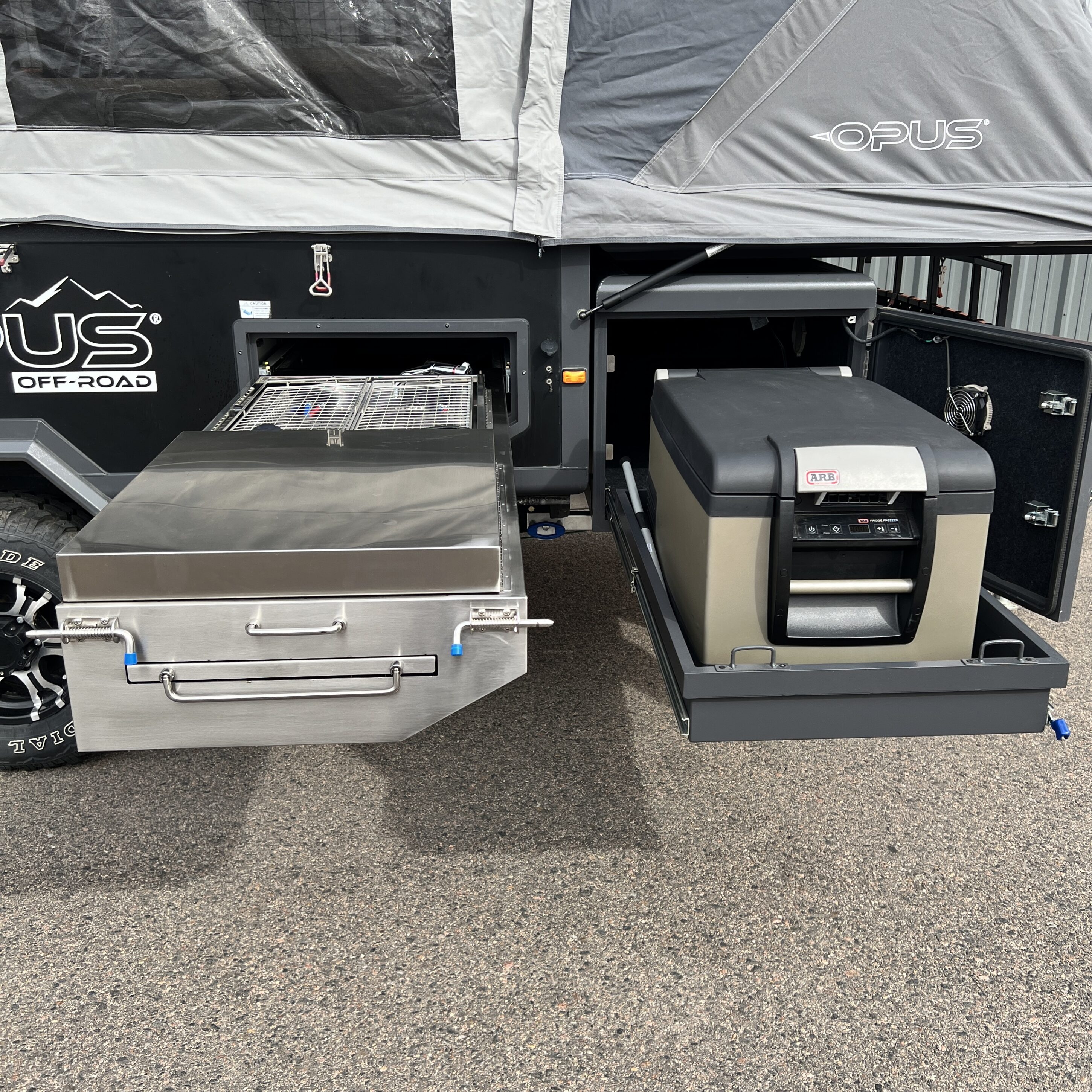 The OPUS OP4’s innovative AIR OPUS inflation system sets it apart. With the push of a button, the tent and included air canopy inflate in minutes, transforming your rugged trailer into a spacious and comfortable living space. No more fumbling with poles or struggling with complicated setups—just instant shelter and relaxation. A king-size bed and a convertible lounge provide ample sleeping space for the whole family. The slide-out kitchen, complete with a two-burner stove, sink, and prep space, makes cooking in the great outdoors a breeze. Plus, with a built-in refrigerator, you can keep your food and drinks cold for the entire trip.