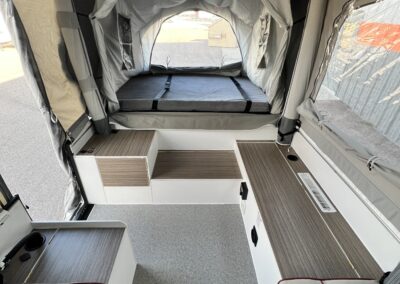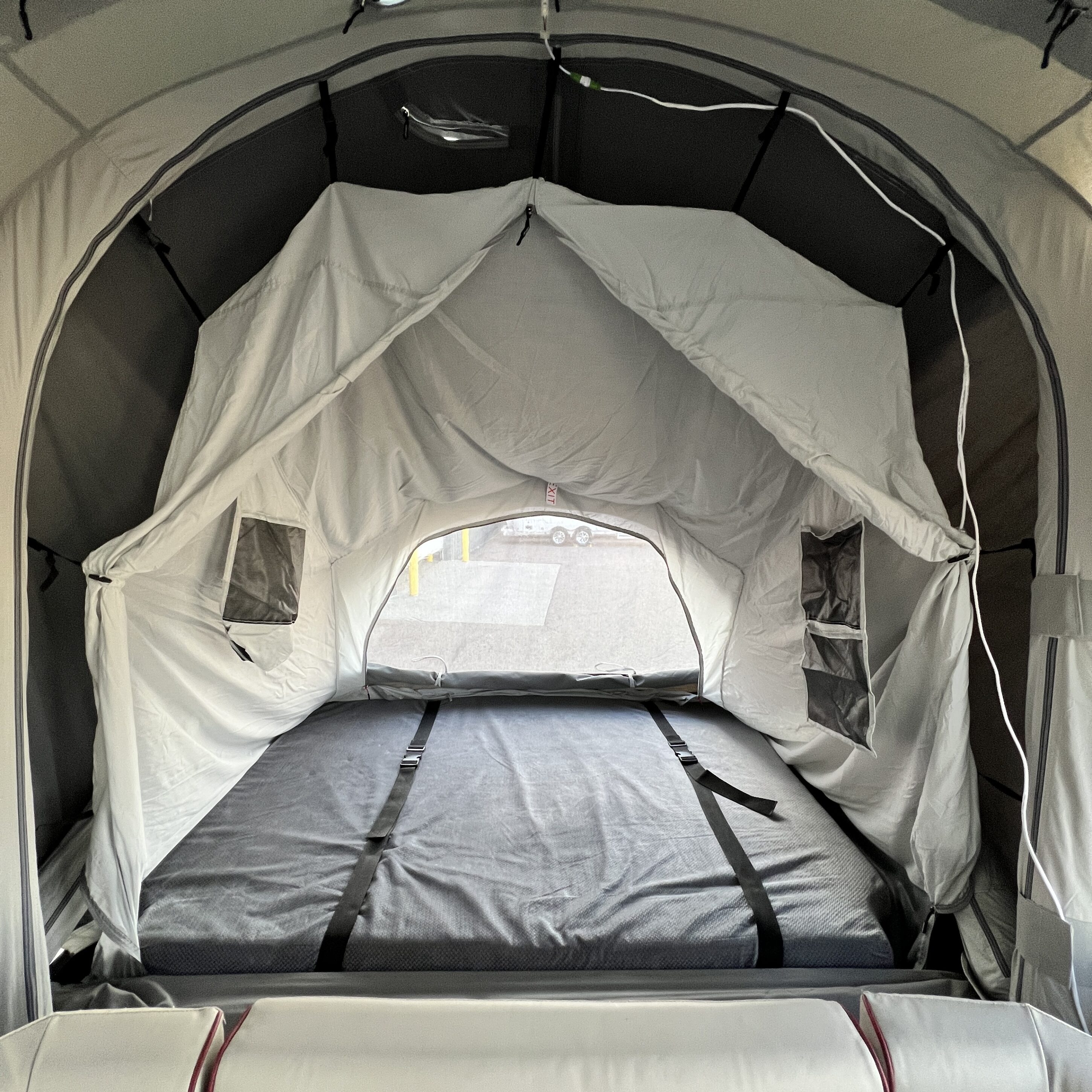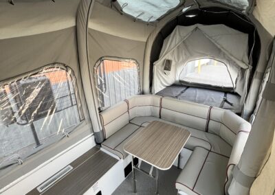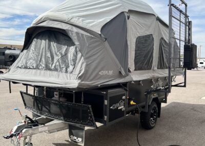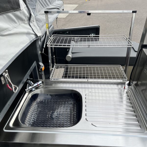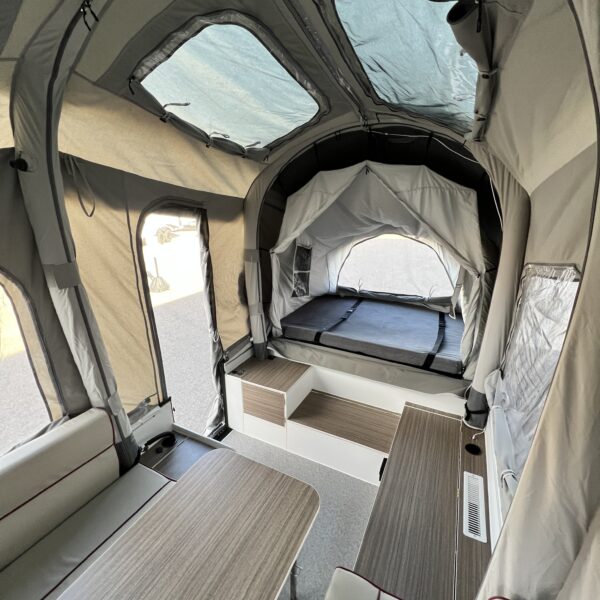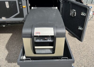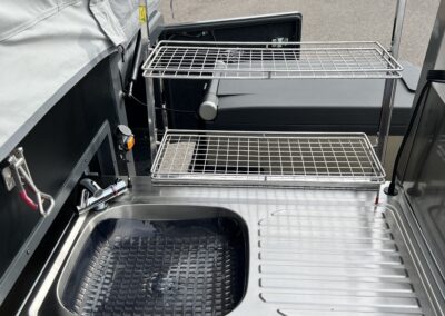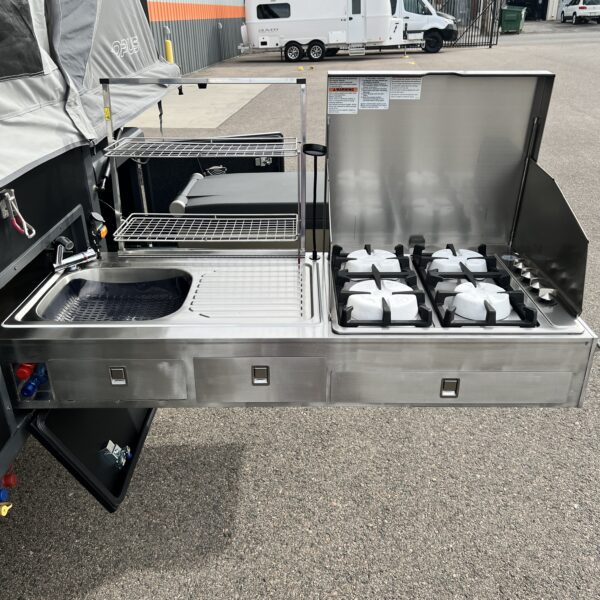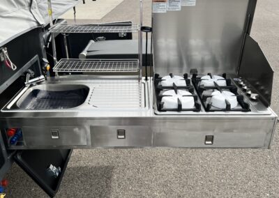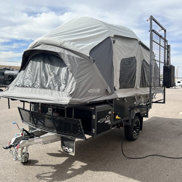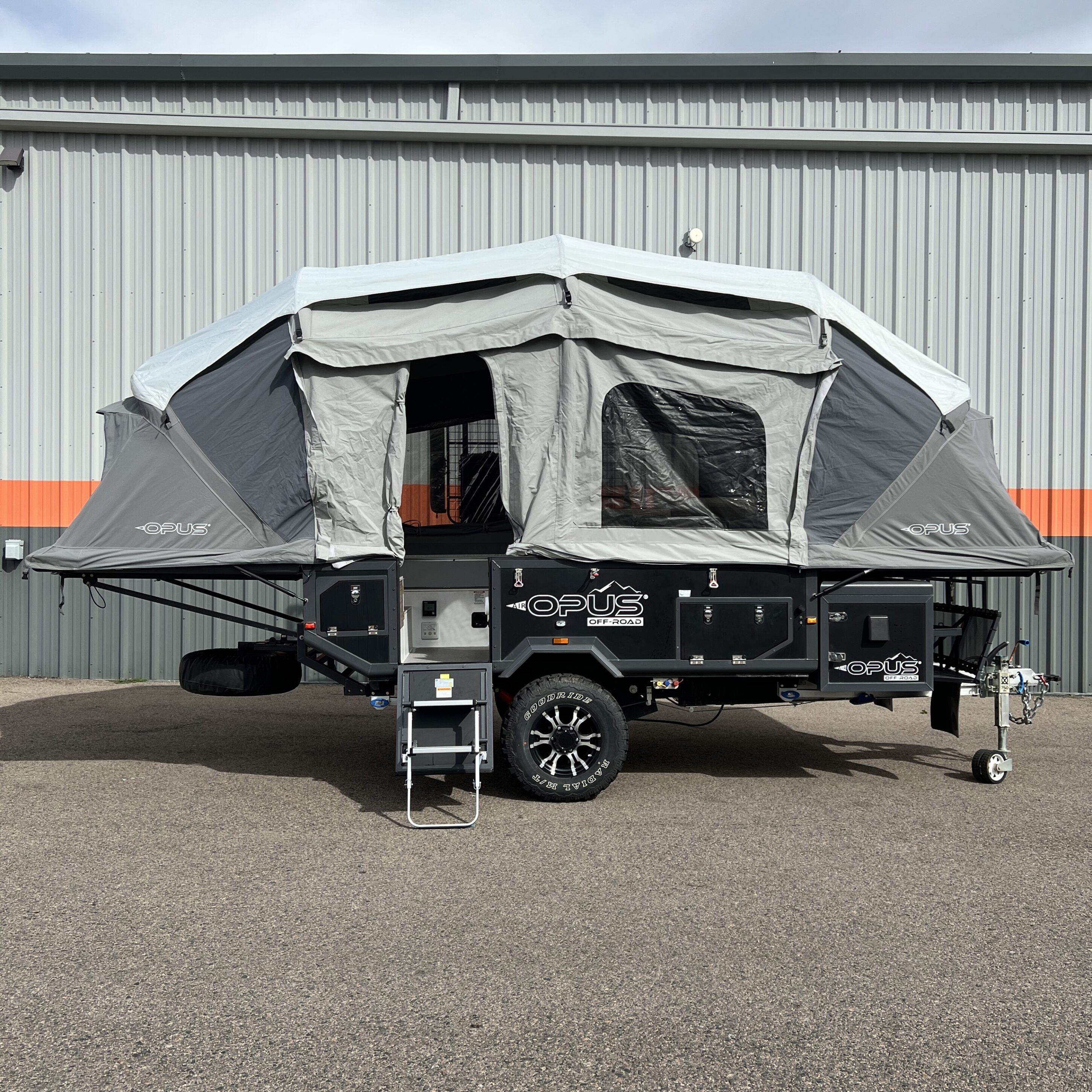 The OPUS OP4’s innovative AIR OPUS inflation system sets it apart. With the push of a button, the tent and included air canopy inflate in minutes, transforming your rugged trailer into a spacious and comfortable living space. No more fumbling with poles or struggling with complicated setups—just instant shelter and relaxation. A king-size bed and a convertible lounge provide ample sleeping space for the whole family. The slide-out kitchen, complete with a two-burner stove, sink, and prep space, makes cooking in the great outdoors a breeze. Plus, with a built-in refrigerator, you can keep your food and drinks cold for the entire trip.