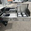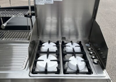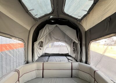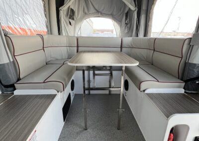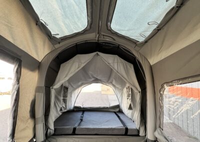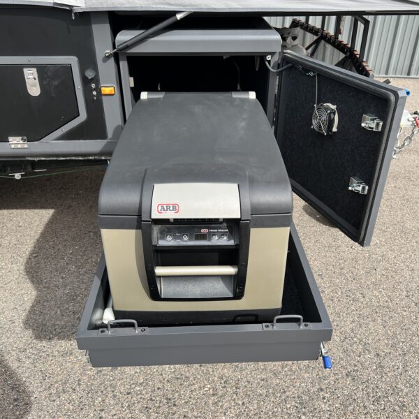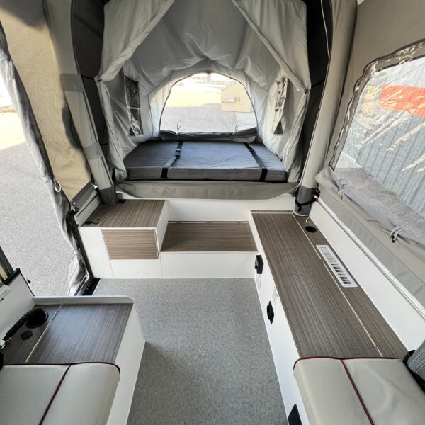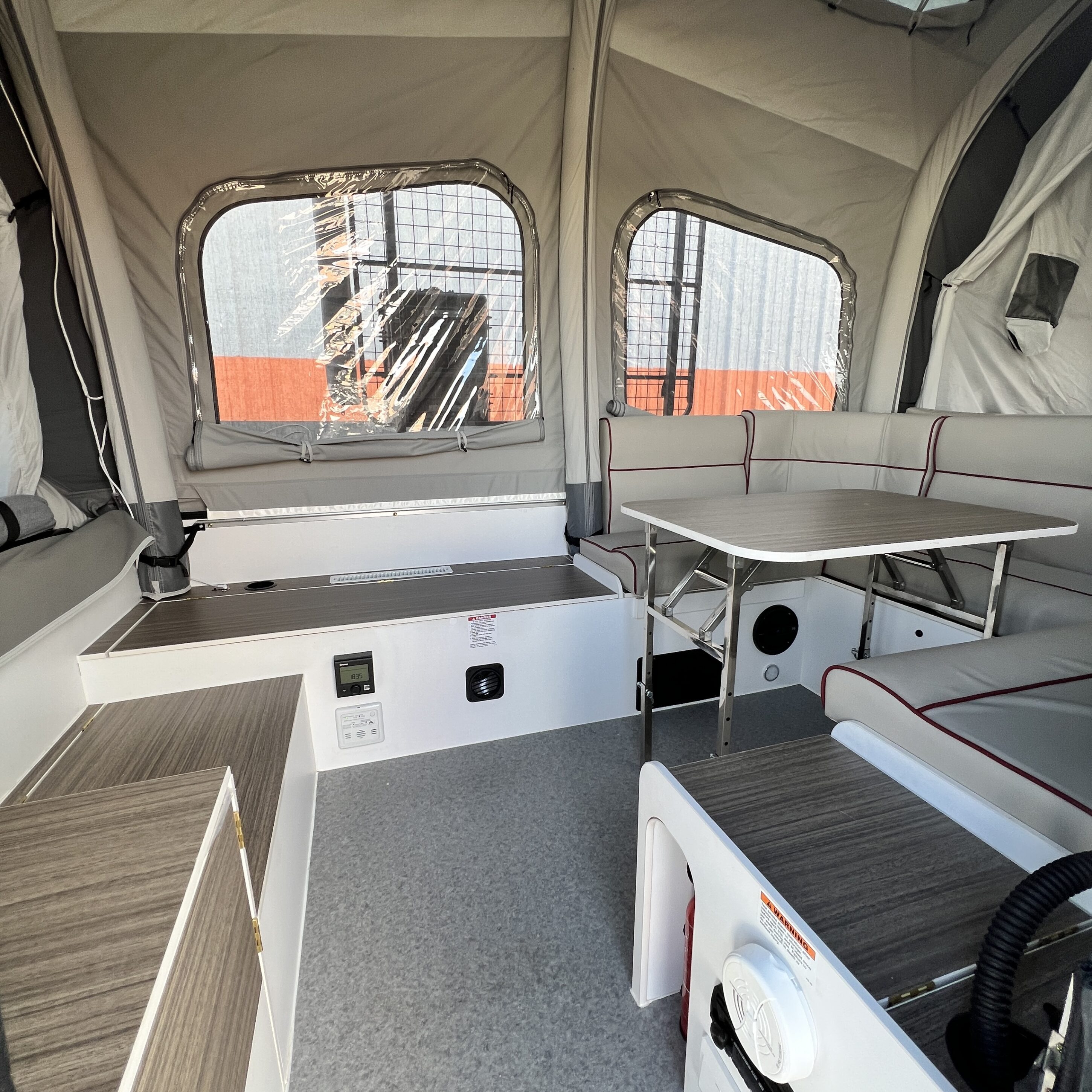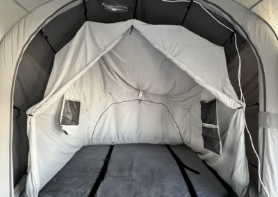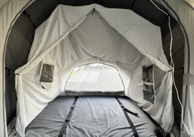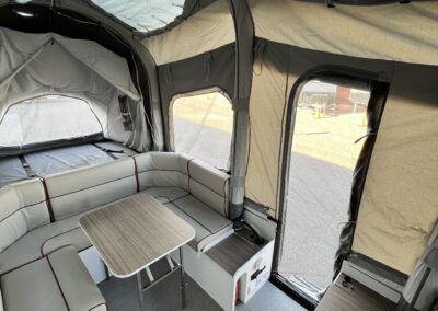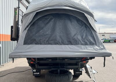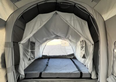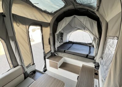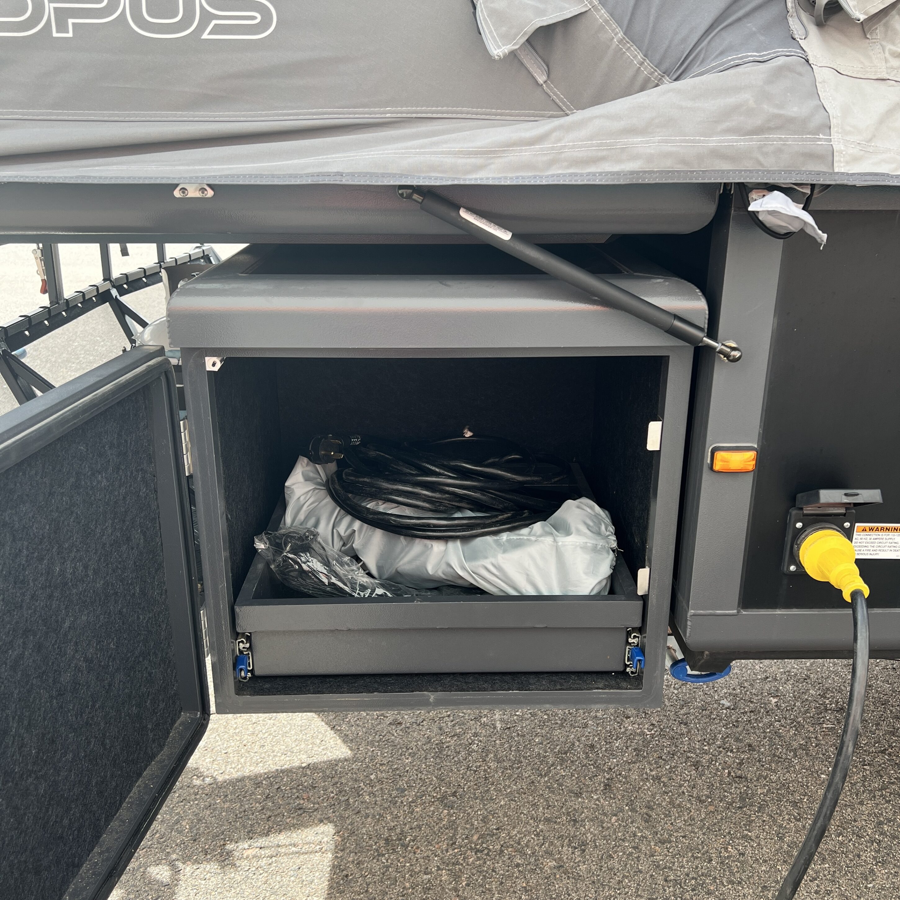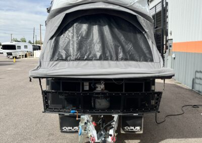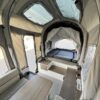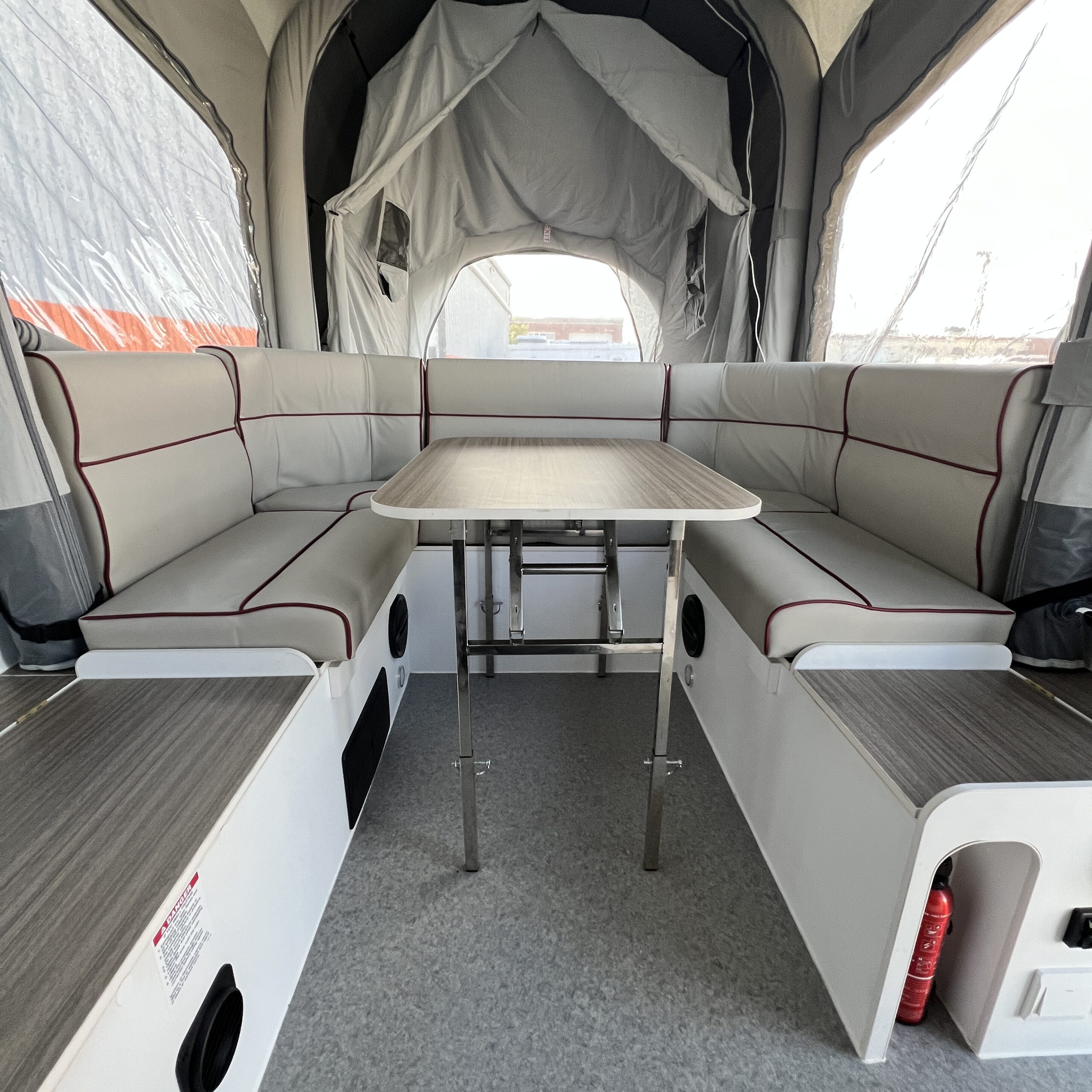 The OPUS OP4’s innovative AIR OPUS inflation system sets it apart. With the push of a button, the tent and included air canopy inflate in minutes, transforming your rugged trailer into a spacious and comfortable living space. No more fumbling with poles or struggling with complicated setups—just instant shelter and relaxation. A king-size bed and a convertible lounge provide ample sleeping space for the whole family. The slide-out kitchen, complete with a two-burner stove, sink, and prep space, makes cooking in the great outdoors a breeze. Plus, with a built-in refrigerator, you can keep your food and drinks cold for the entire trip.