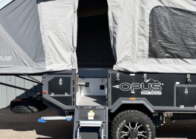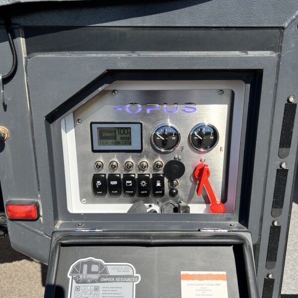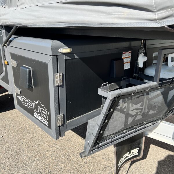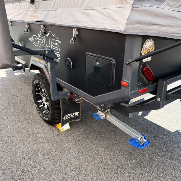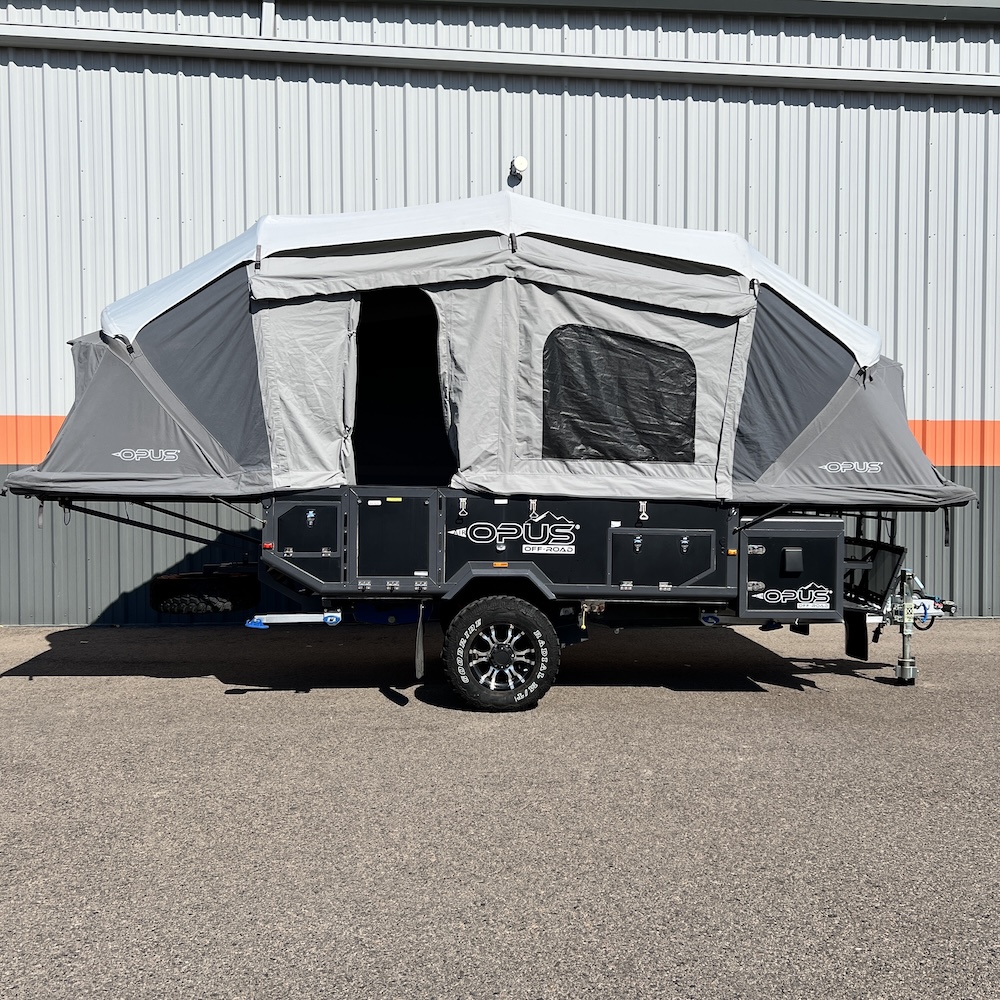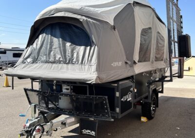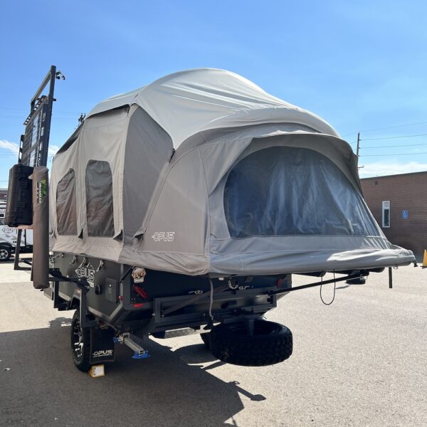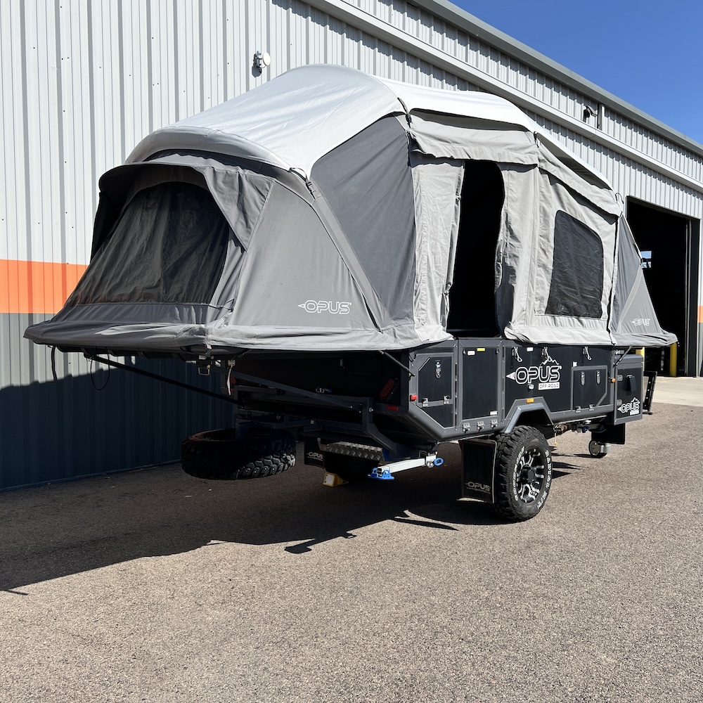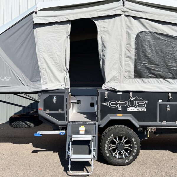 Explore off-grid with this well-maintained newer year model Opus OP4 with the lithium upgrade. The OP4 is built for rugged terrain with the independent trailing arm suspension with dual shock absorbers, galvanized steel chassis, dual shocks, coil springs, DO35 articulating hitch and all-terrain tires. The patented AIR Tent Technology inflates the tent with the push of a button. No poles on this updated popup!