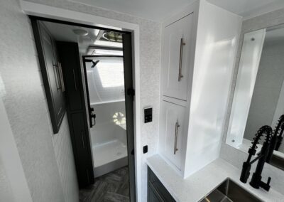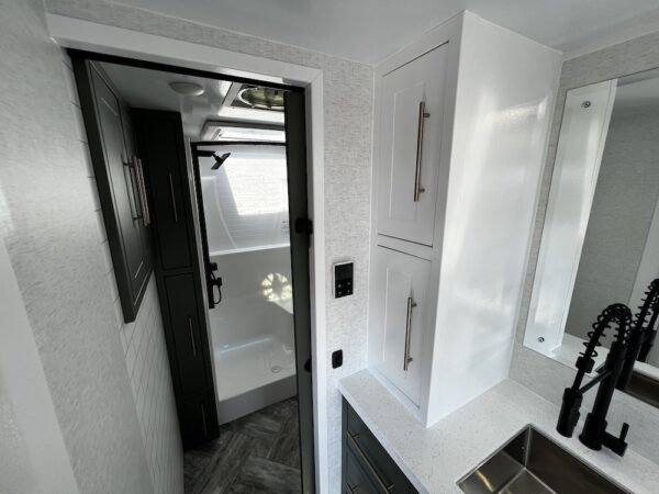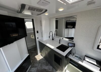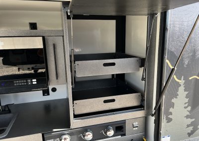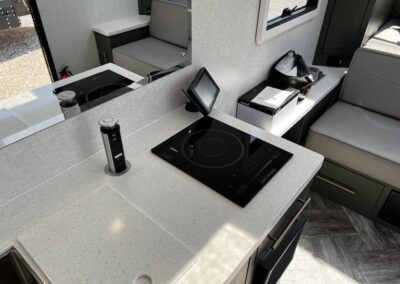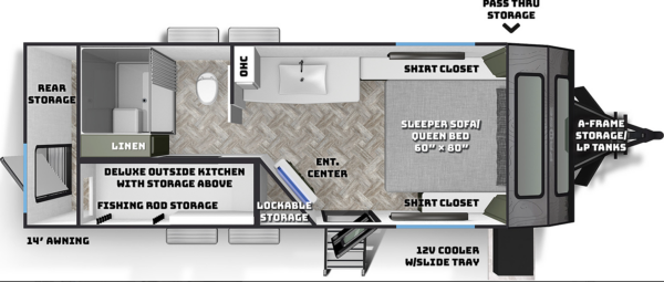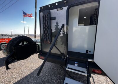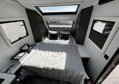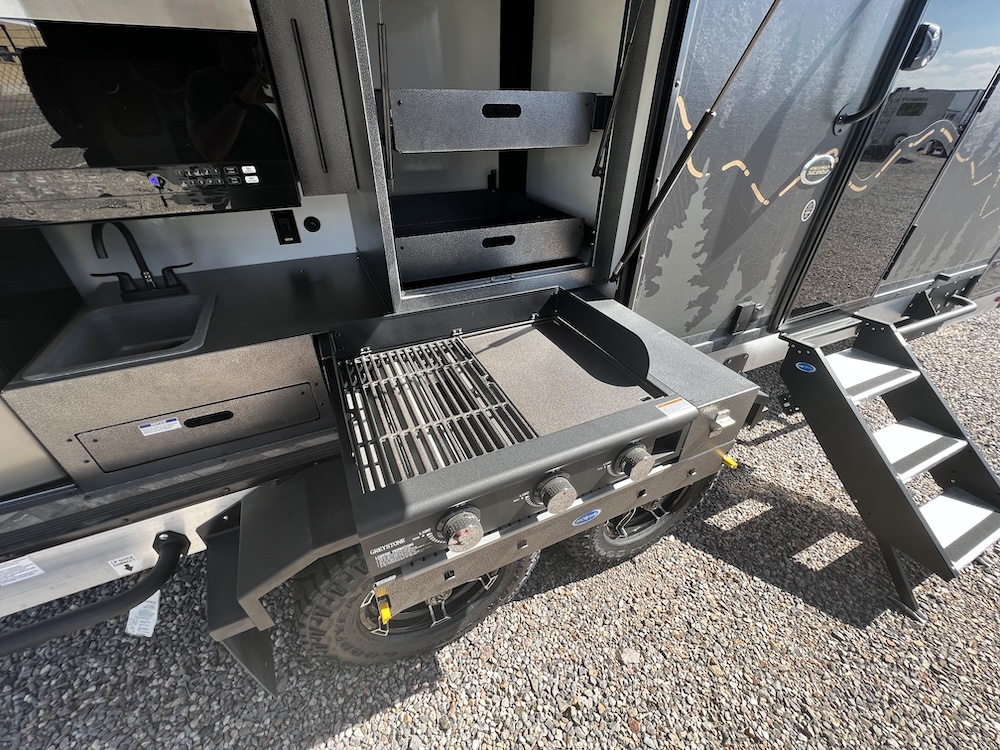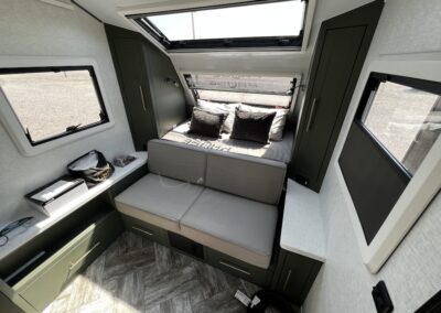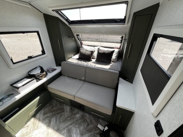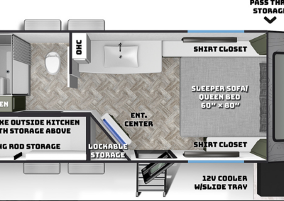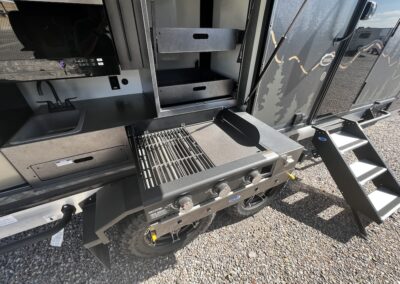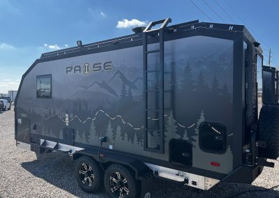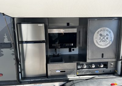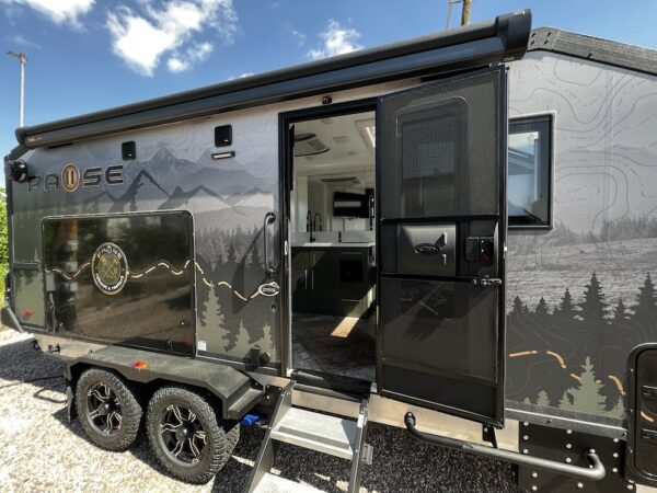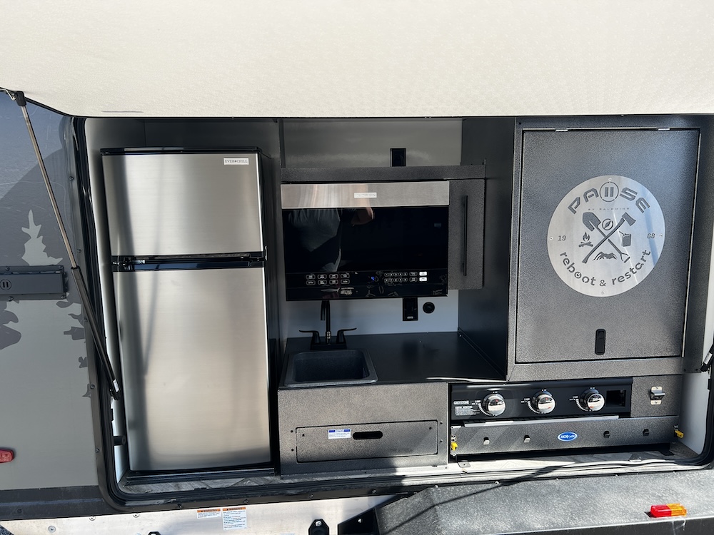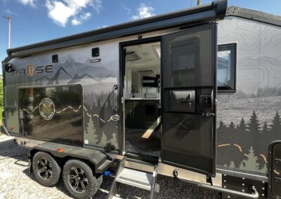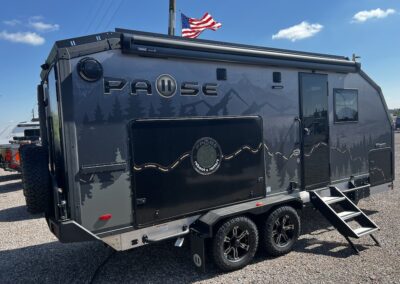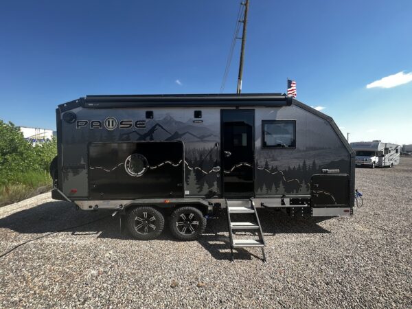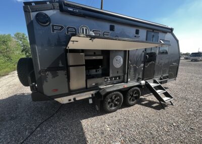A MorRyde Huck-Rivot aluminum frame, adjustable air ride suspension, TransCore thermoplastic composite structure, and wood-free design are all used to produce the strongest, long-lasting overland trailer on the market today. In this Pause XC20.2 floor plan, you will enjoy your time cooking in the great outdoors with the deluxe outside kitchen. With a 4.5 CF Refer, a microwave, sink, a grill and griddle combination, and a pantry, you will have everything you need for a large meal. Furthermore, with the Palomino Pause XC20.2 2023. you will be granted a large storage room in the back of the coach and a lockable storage area behind your entertainment center wall. Full-size queen bed in the front with shirt closets and outlets on both sides. A 600-watt Viktron Solar package with 540-watt Battleborn Lithium batteries, a Viktron 3000-watt inverter, and 76 gallons of fresh water means you can enjoy the great outdoors even longer!!