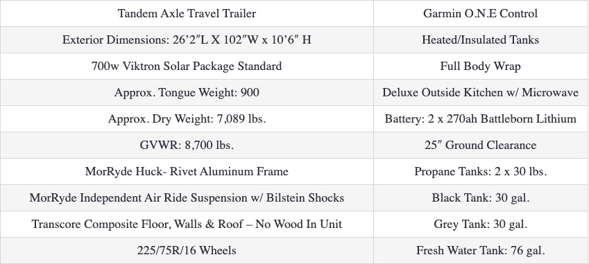 | Batteries | 2) 270ah Lithium |
